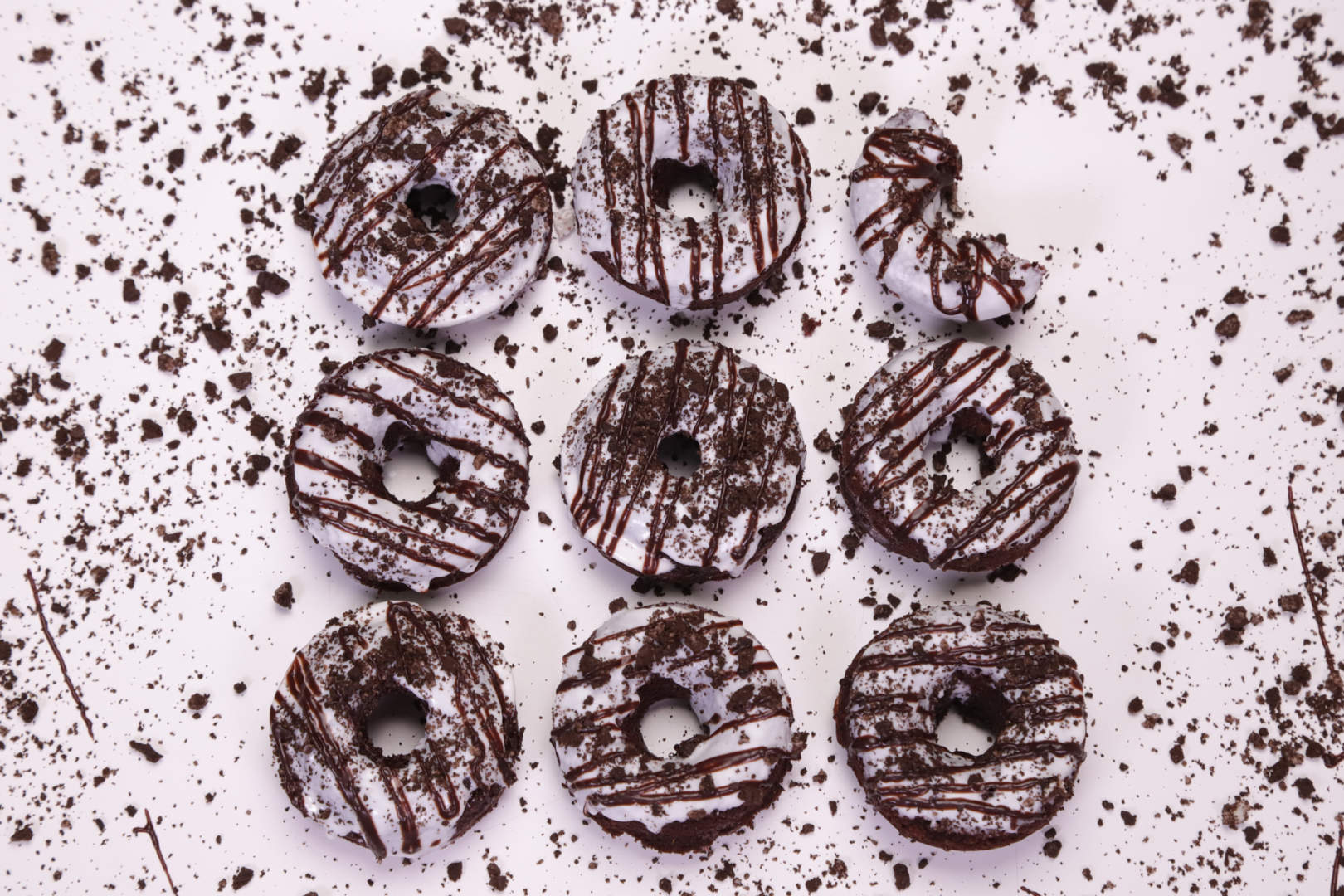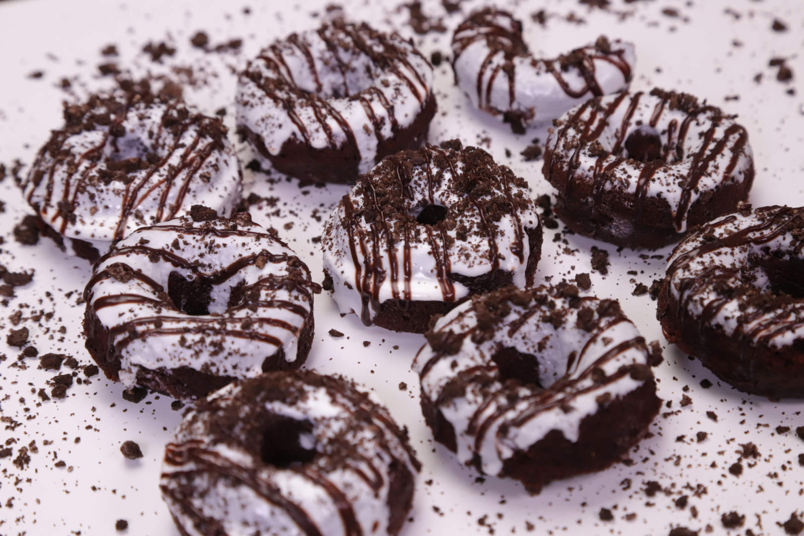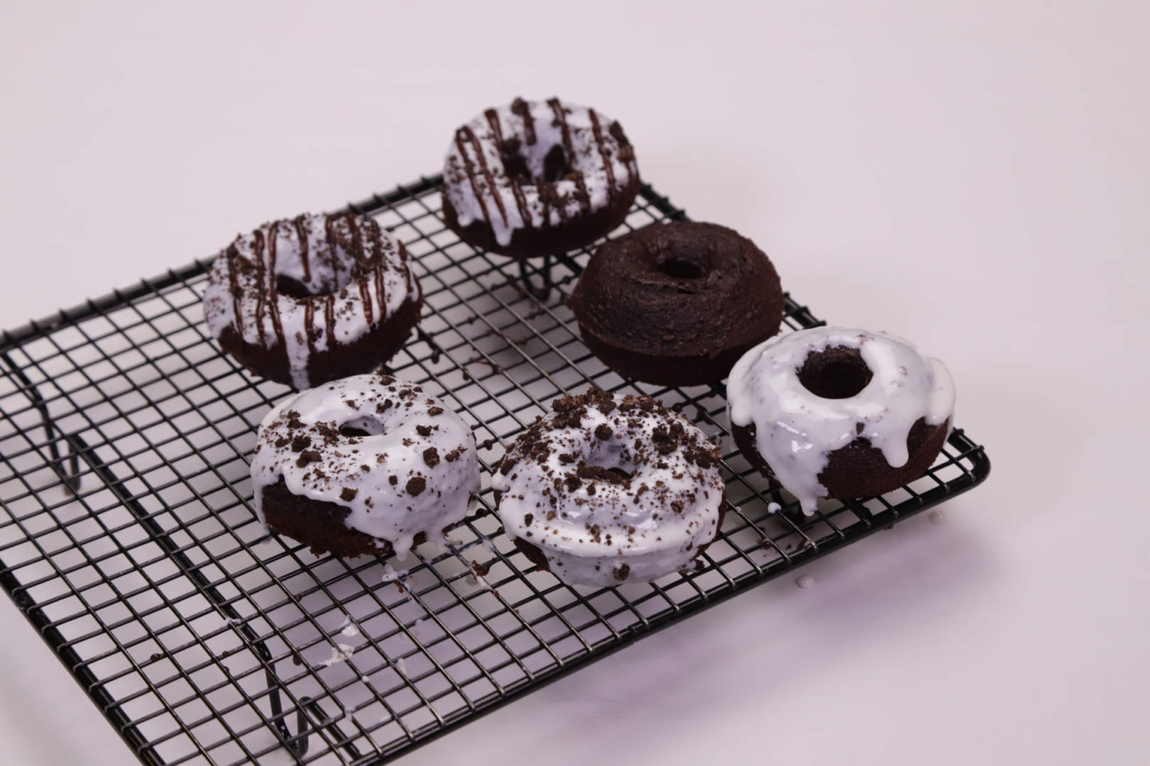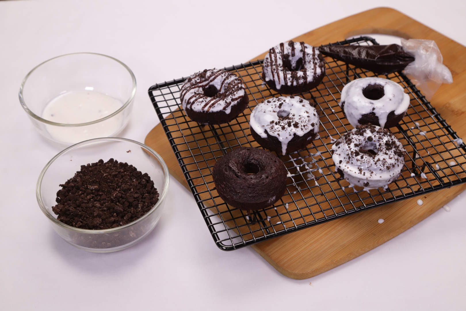 Carefully dip donuts into prepared glaze, or pour the glaze over the donut. Top with cookie crumbs then drizzle with melted chocolate.