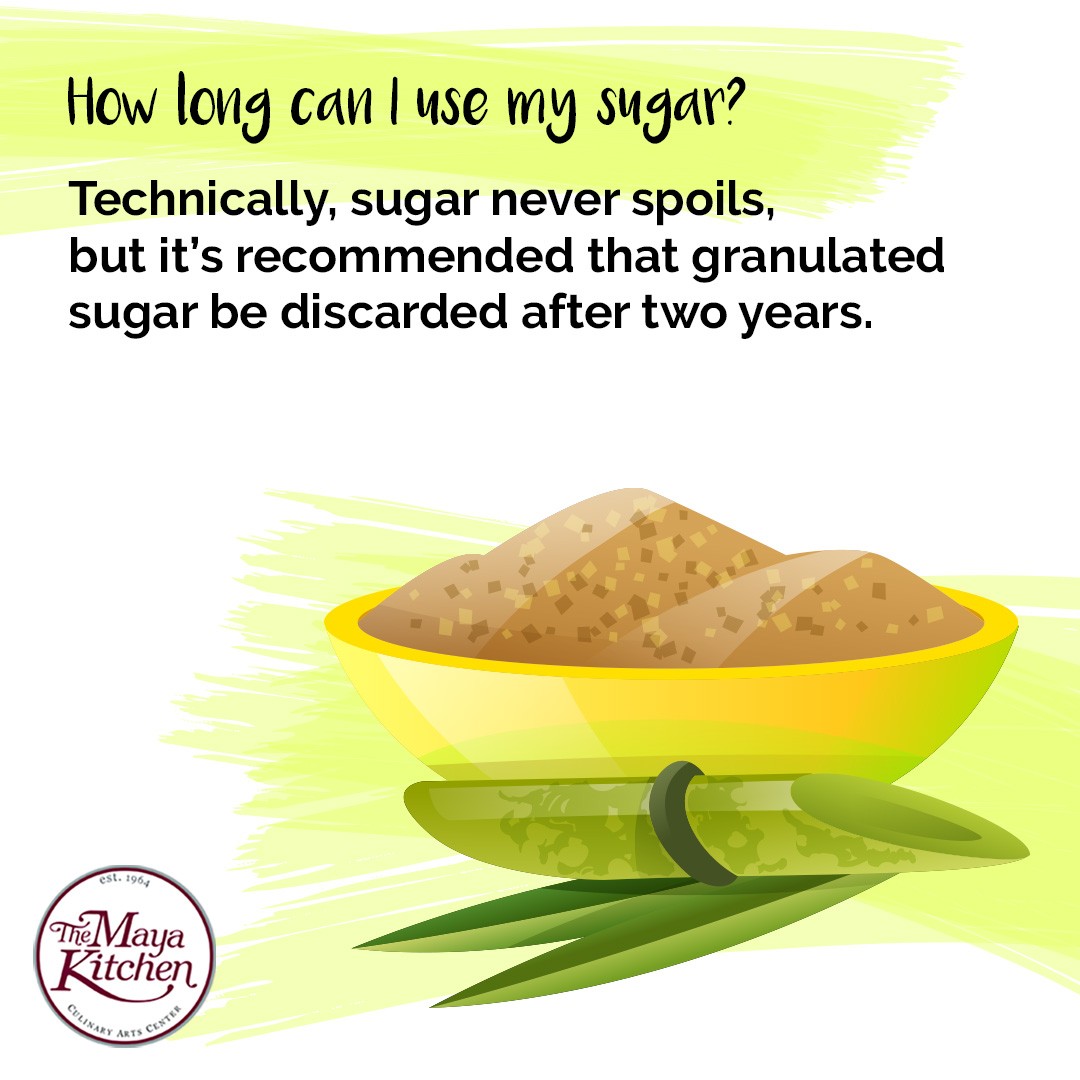 Technically, sugar never spoils, but it’s recommended that granulated sugar be discarded after two years.