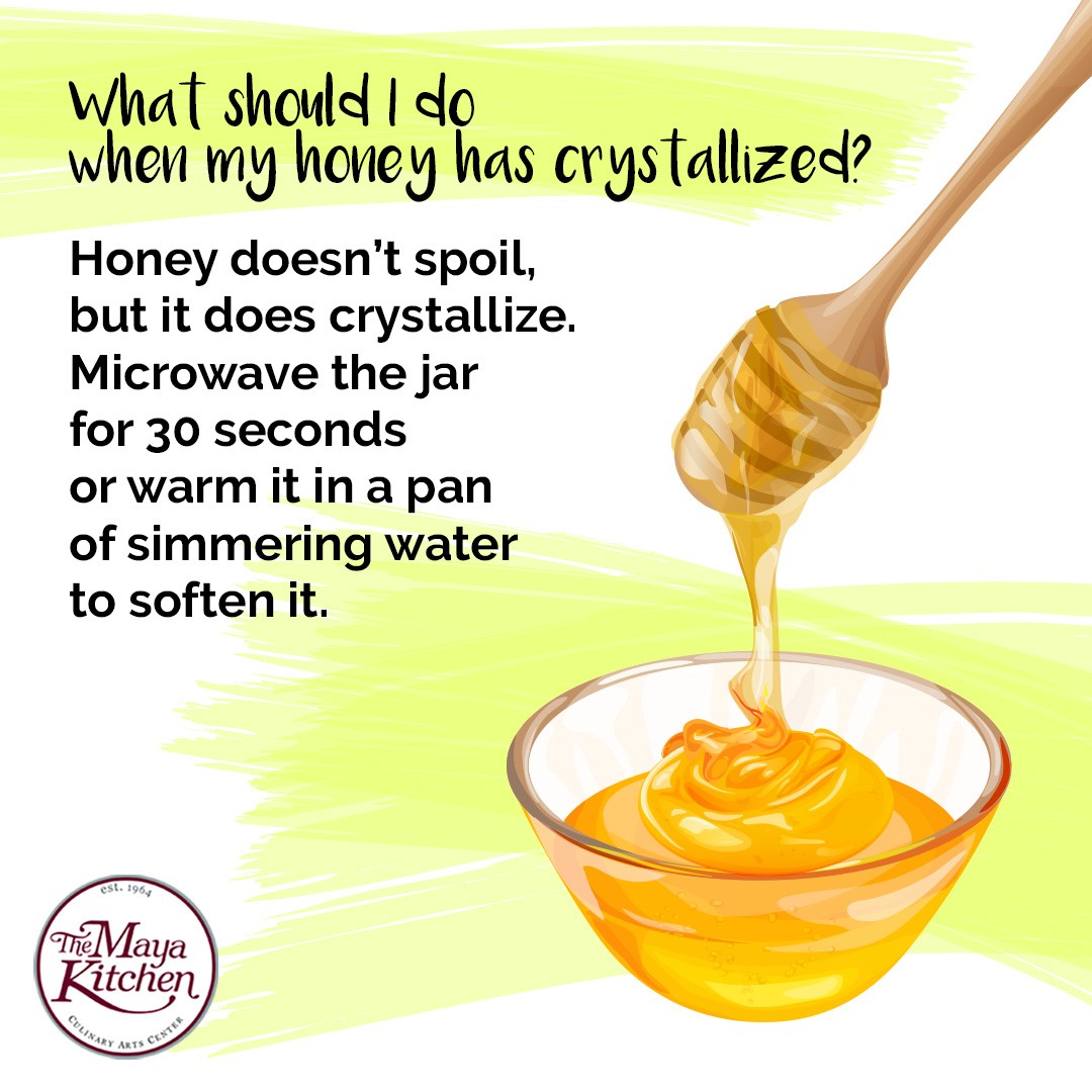 Honey doesn’t spoil, but it does crystallize. Microwave the jar for 30 seconds or warm it in a pan of simmering water to soften it.