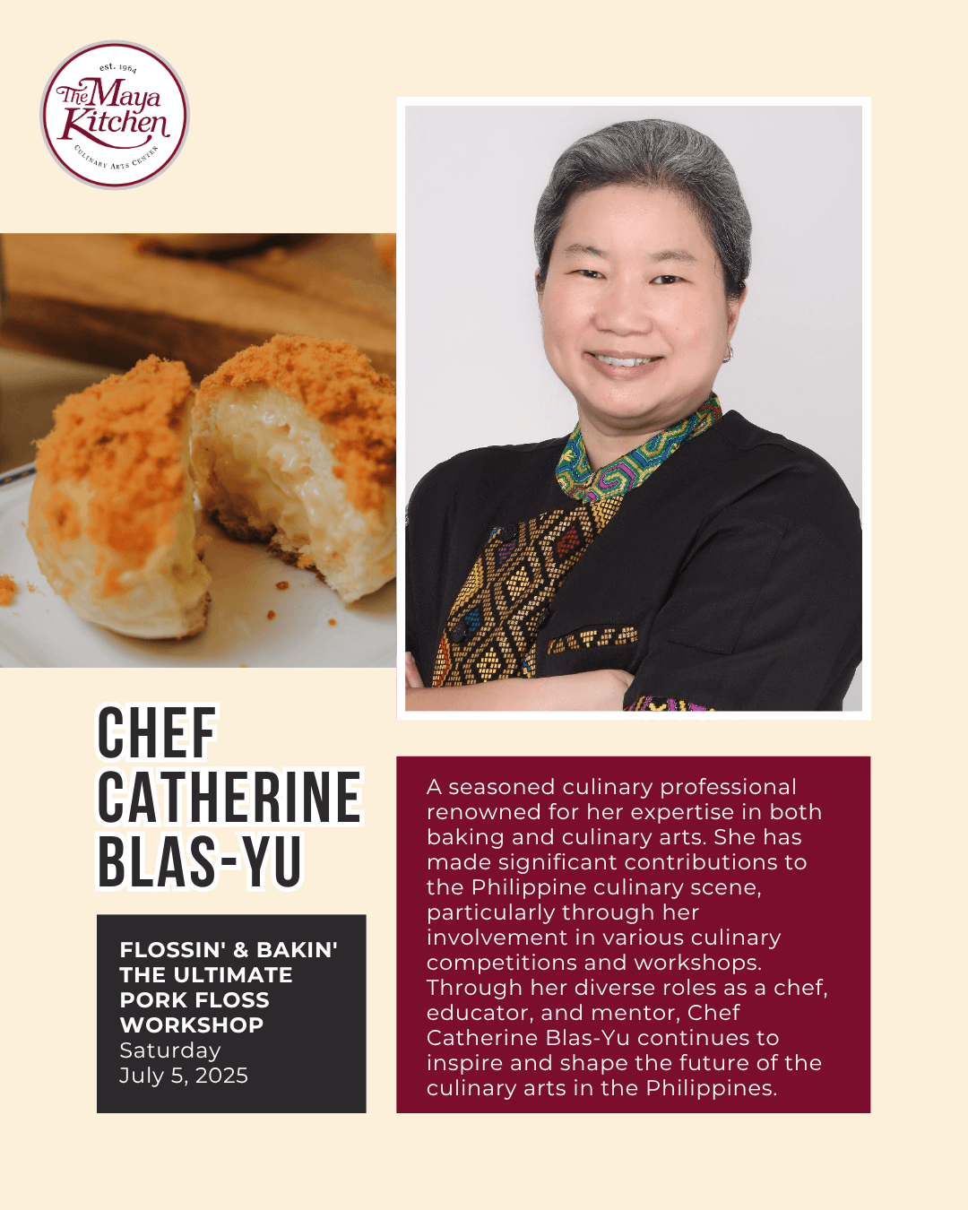 Led by the talented and passionate Chef Catherine Blas-Yu, this workshop is perfect for pork floss fans and curious bakers alike. Discover how this beloved ingredient can shine in both sweet and savory treats as you learn the techniques behind fluffy breads, tender cakes, and creative snacks, all elevated by that unmistakable flossy goodness. From rolling up sponge cakes to crafting crave-worthy cookies, you’ll leave class with delicious creations and a new appreciation for this umami-packed favorite.